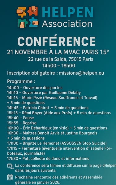 La conférence HELPEN a été un véritable succès, dans une salle comble. Chercheurs, journalistes, juristes, médecins, psychologues, délégués ministériels et acteurs associatifs ont partagé un moment d’une rare intensité, porté par un auditoire attentif et mobilisé. Un pas important dans la lutte collective contre le harcèlement moral.