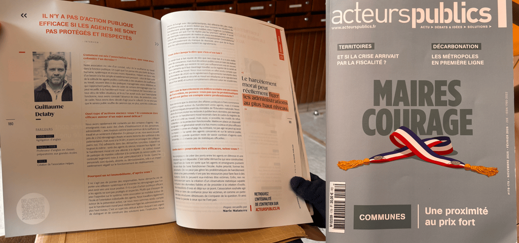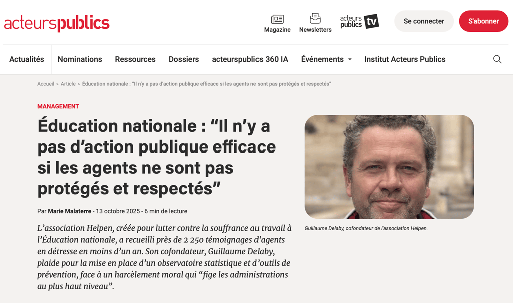 Un grand merci à Marie Malaterre pour son excellent article sur Acteurs Publics, qui présente Helpen et sa démarche constructive. « Éducation nationale : “Il n’y a pas d’action publique efficace si les agents ne sont pas protégés et respectés” ».
