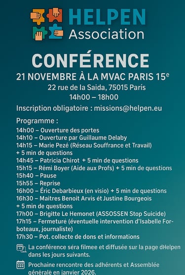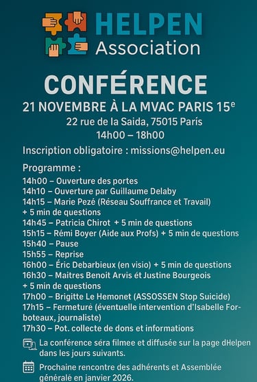Vidéos de la conférence de l'association Helpen le 21 novembre 2025 à la MVAC du 15ème, Paris. Helpen est une association de bénévoles, reconnue d'intérêt général
