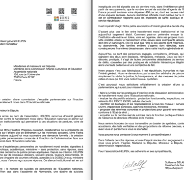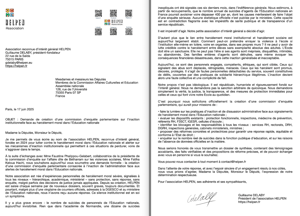 Je me permets de vous écrire au nom de l’association HELPEN, reconnue d’intérêt général, fondée en 2024 pour lutter contre le harcèlement moral dans l’Éducation nationale et alerter sur les mécanismes d’inaction institutionnelle qui permettent à ces situations de perdurer, voire de s’aggraver dans le temps.