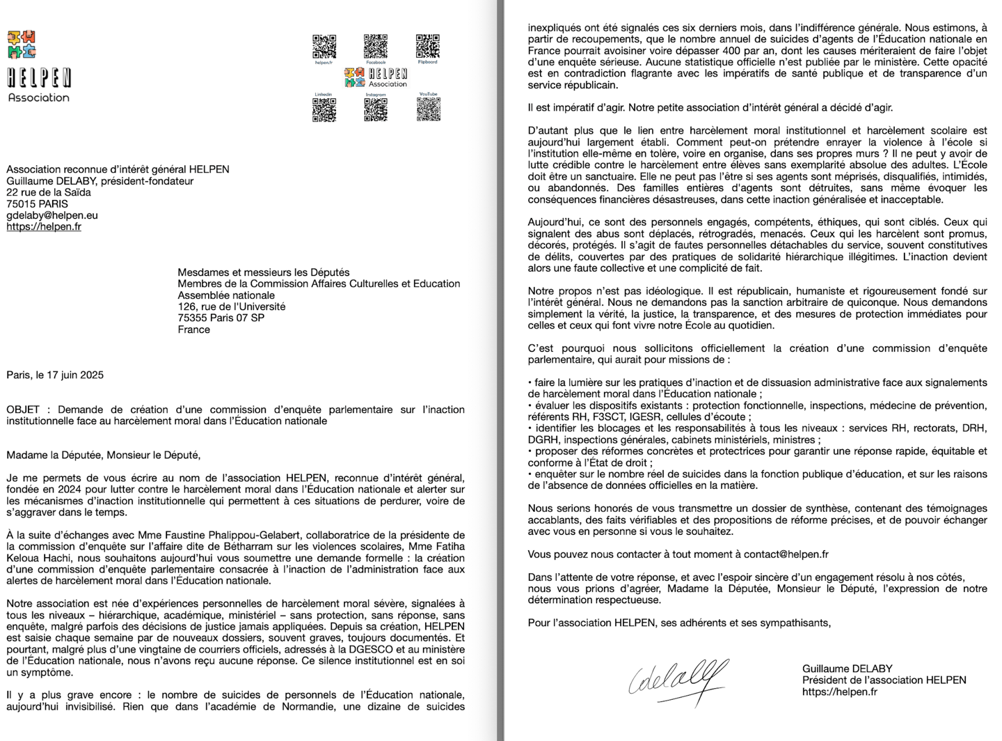 HELPEN, association reconnue d'intérêt général, demande la création d'une commission d'enquête parlementaire le 17 juin 2025 et lance une pétition.