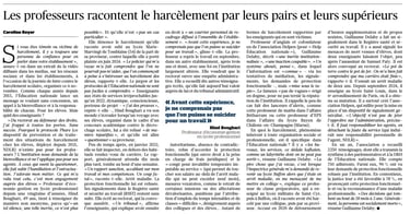 Dans son édition du 6 novembre, Le Figaro consacre un dossier à la journée de lutte contre le harcèlement. Mais cette fois, la parole est donnée aux enseignants victimes… du harcèlement de leurs pairs ou de leur hiérarchie. Merci à Caroline Beyer pour cet article. Et bravo à Hind Boughari, notre adhérente de la première heure, pour son courage.